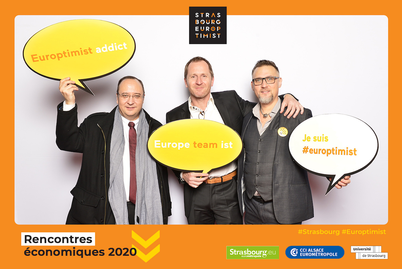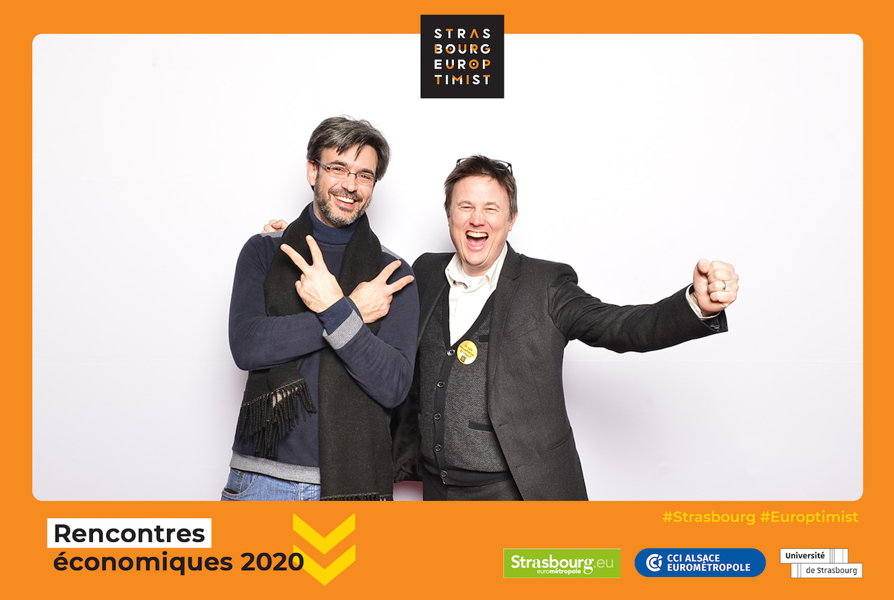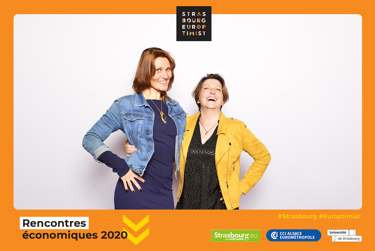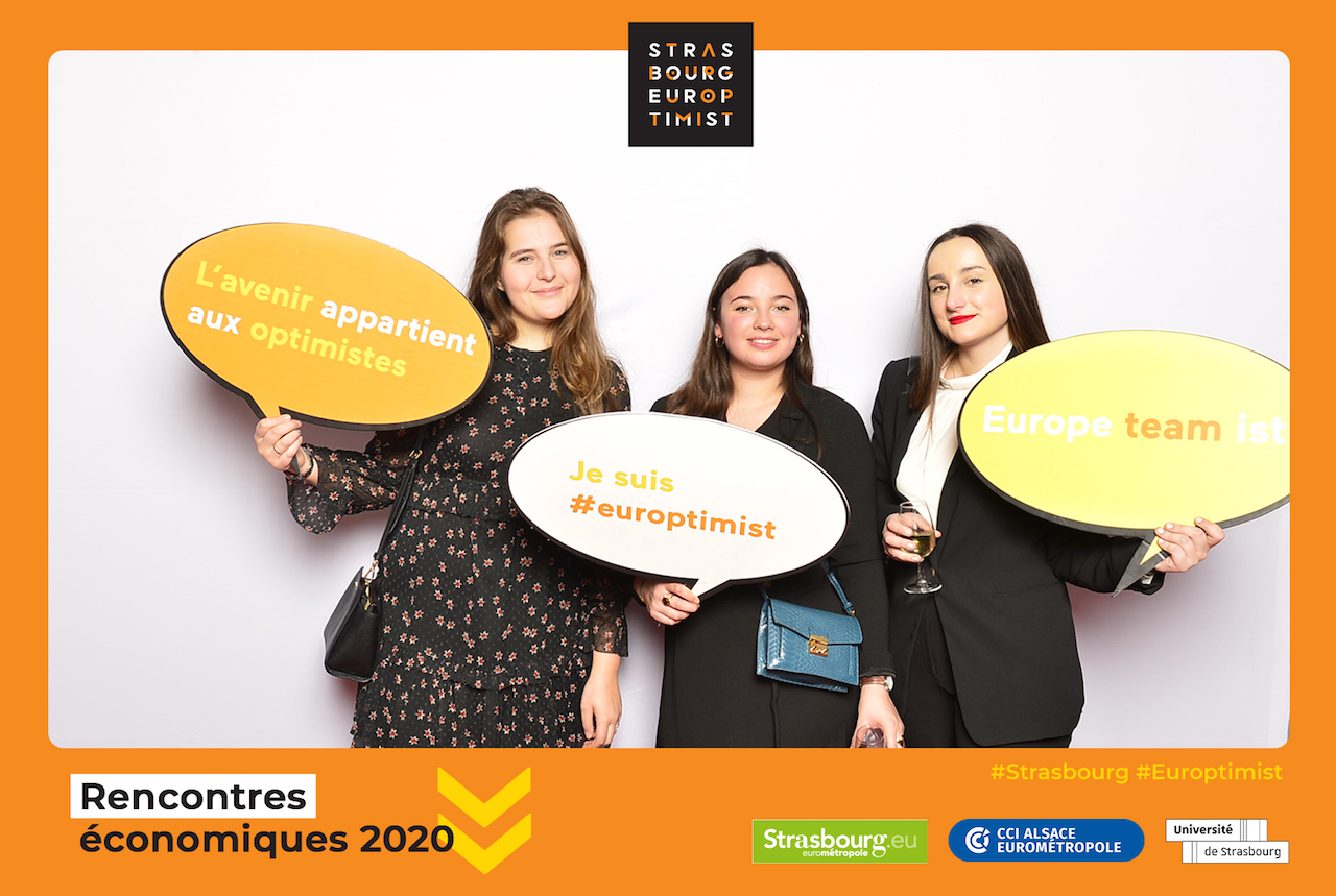 C’est également une occasion de proposer un photocall à vos visiteurs. S’ils portent des masquent, ils peuvent également « porter » des messages comme dans un des exemples ci-dessous pour les Rencontres Économiques de Strasbourg 🙂